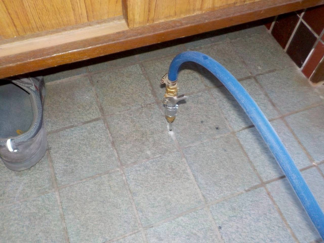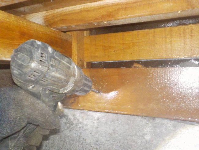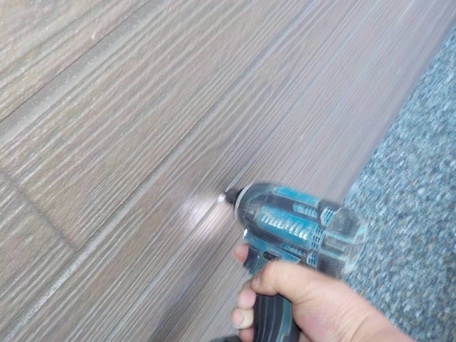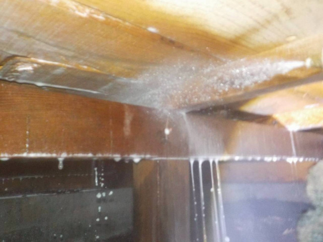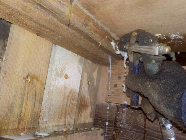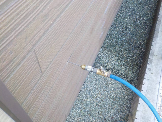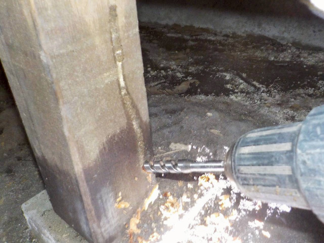 なかなか見ないと思いますが、ただ薬剤を噴霧してる訳じゃないんですよ。主要箇所や被害ヵ所など木材に穴あけをし薬剤を注入しています、玄関土間や外壁など穴あけヵ所は全てパテやモルタルで補修致します。